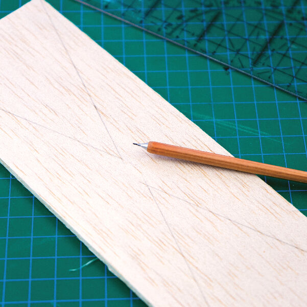 Teken met een geodriehoek en een potlood twee gelijke driehoeken op het Balsahout.