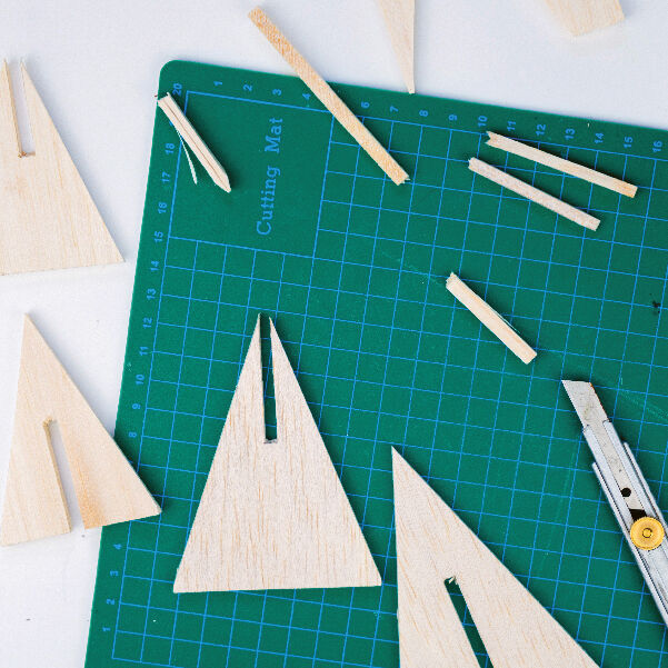 Snij de driehoeken met behulp van een snijmes en een meetlat voorzichtig uit. Maak vervolgens aan de bovenkant en onderaan een rechtlijnige opening in de driehoeken.