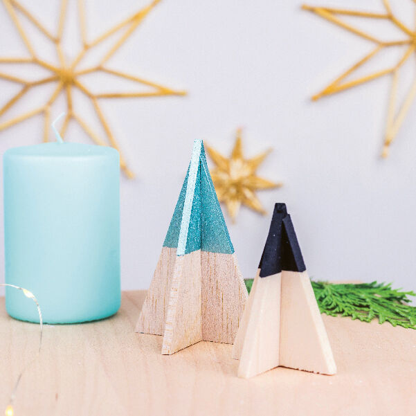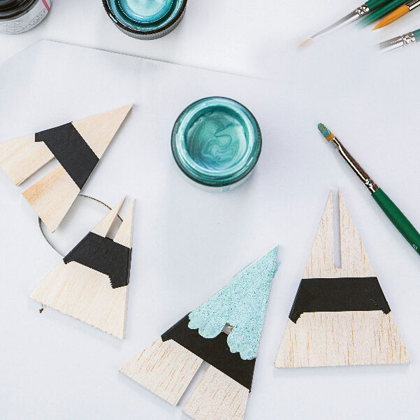 Verwijder daarna de schilderstape en laat de verf drogen. Schuif de driehoeken in elkaar en je kerstboompjes zijn klaar.