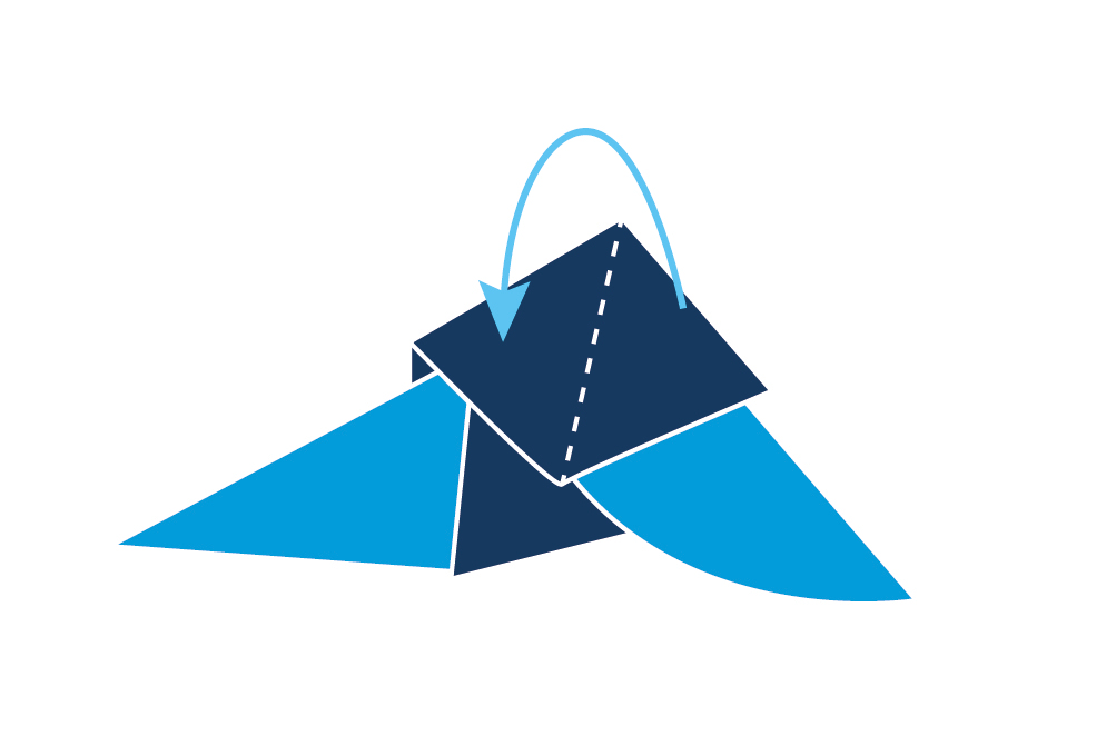 Til de rechter bovenpunt in het midden op (donkerblauw deel) en vouw over de middellijn naar de linkerkant van het servet toe.